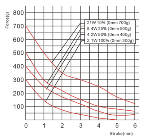 縱向:代表電磁鐵在對應行程時的力量   單位為克(g