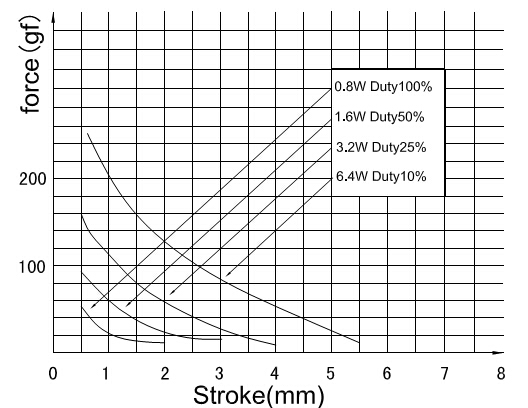 縱向:代表電磁鐵在對應(yīng)行程時(shí)的力量 單位為克(g)